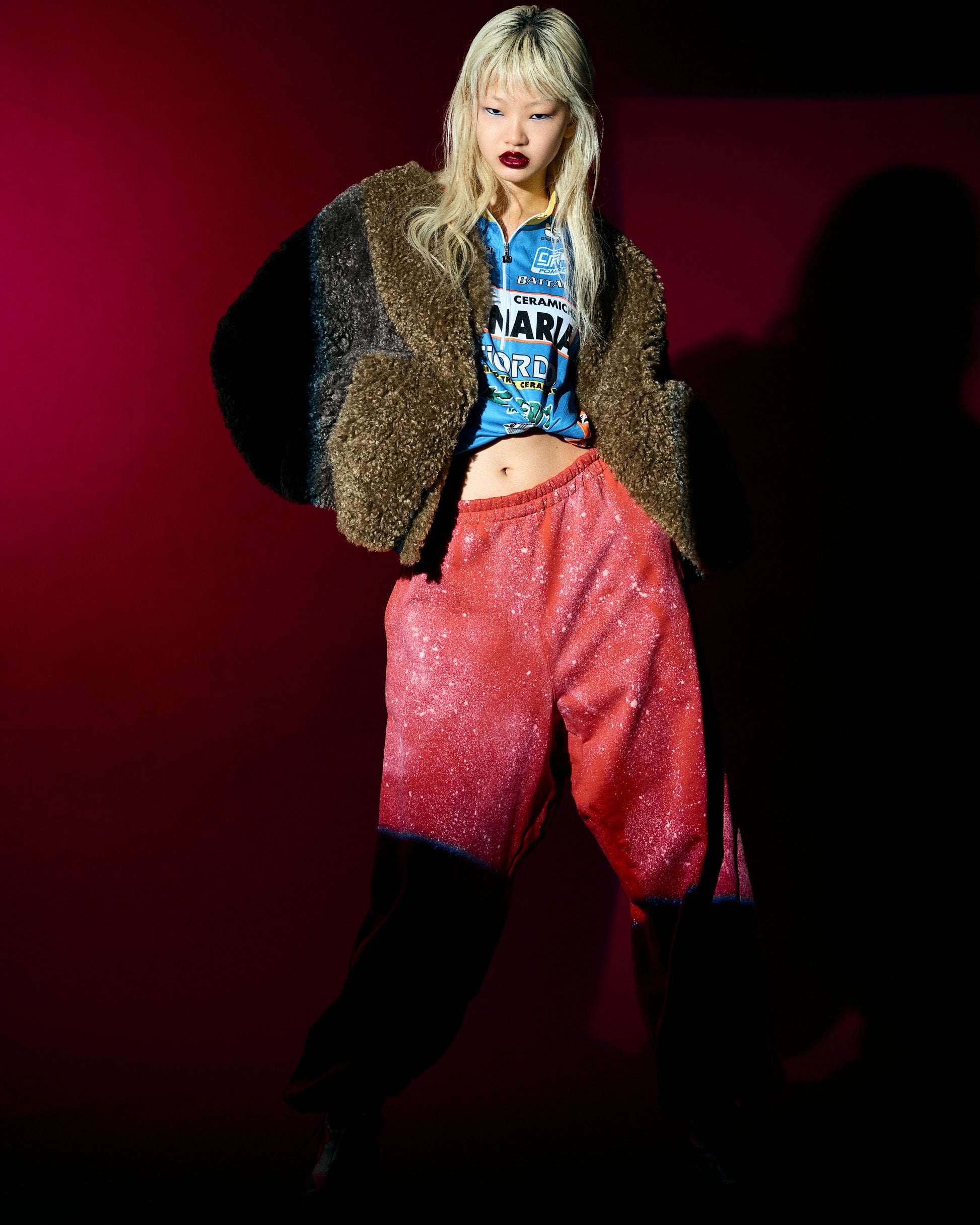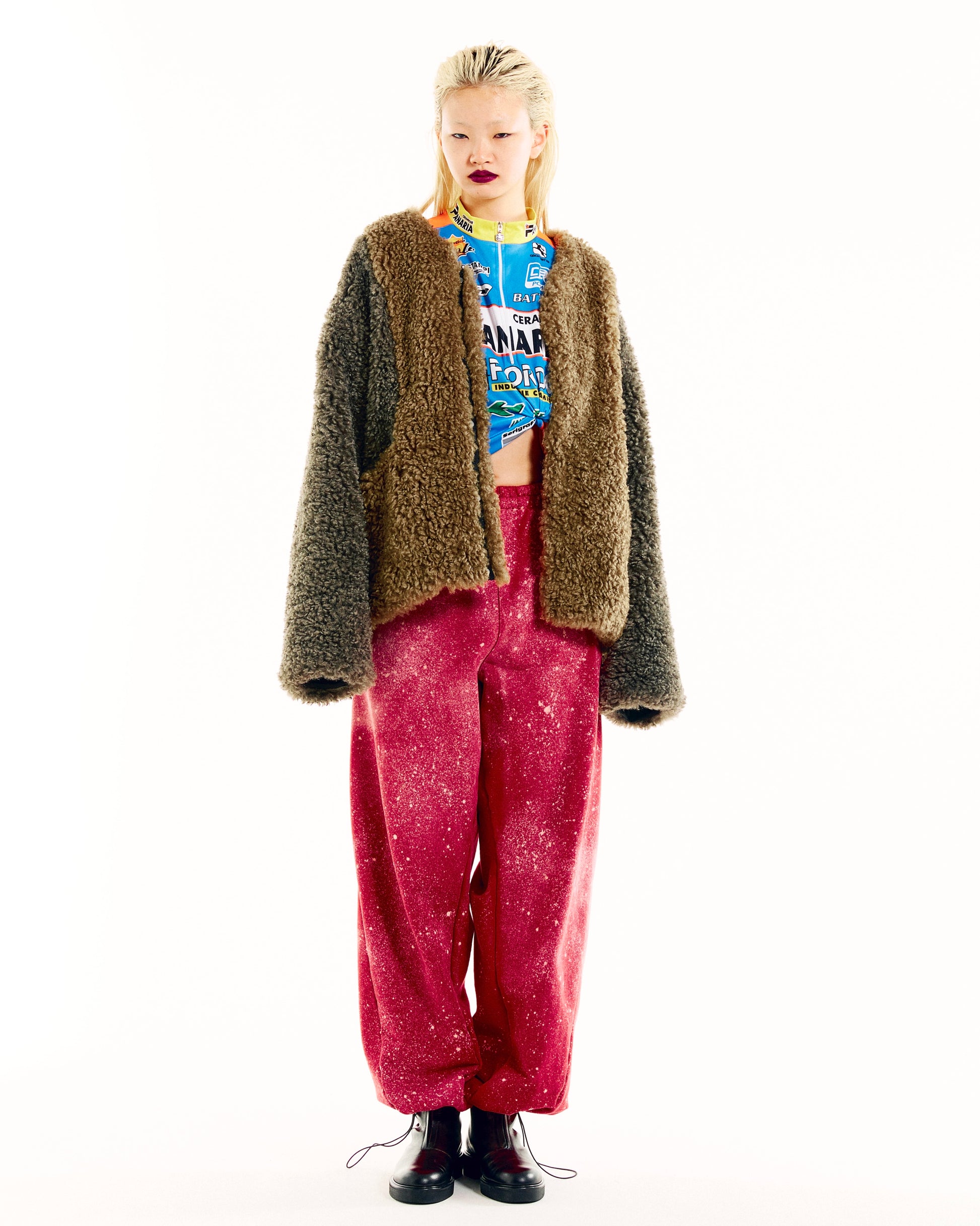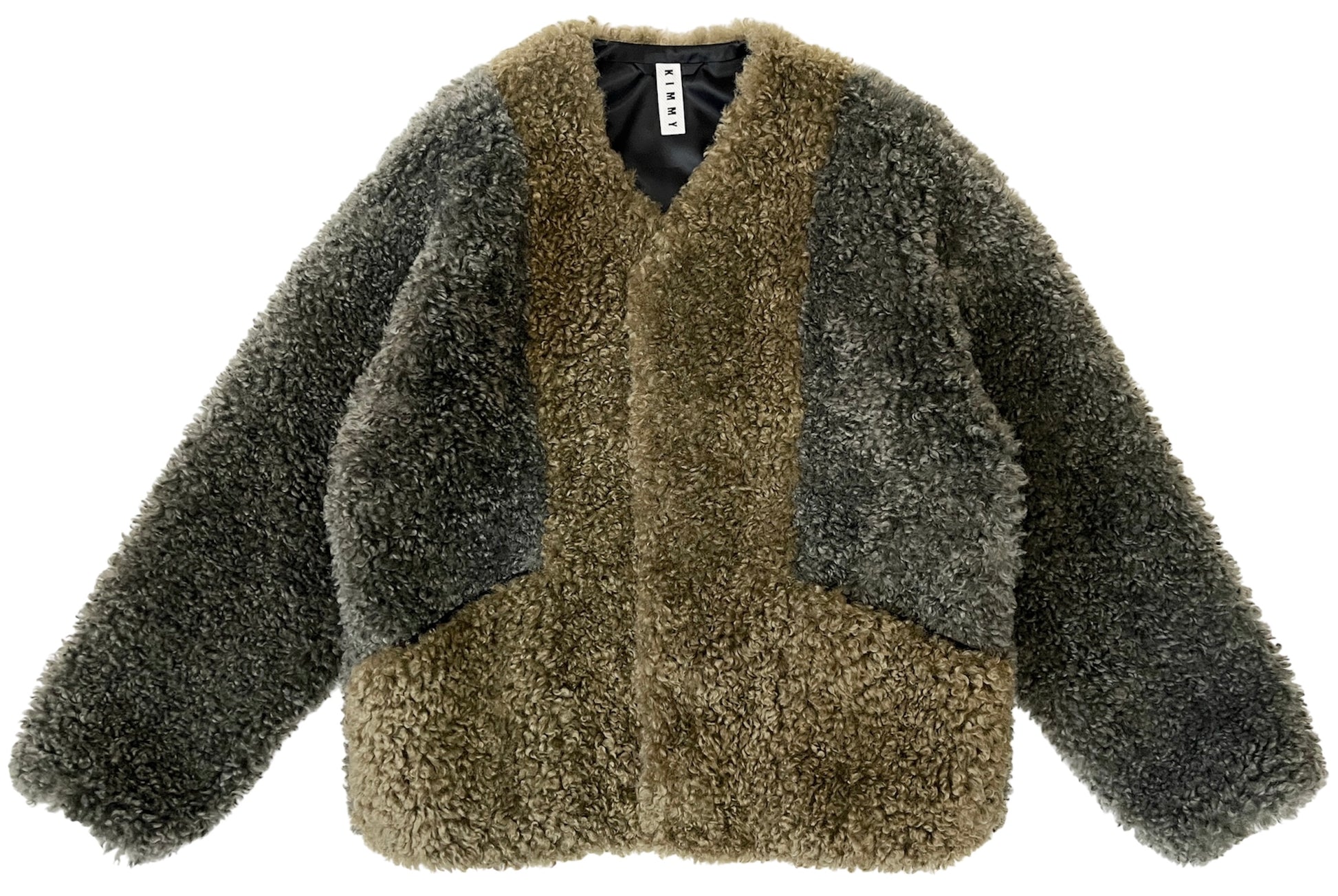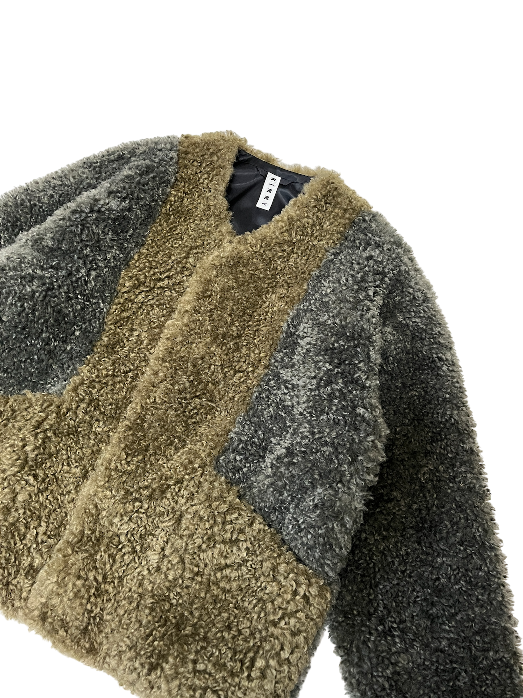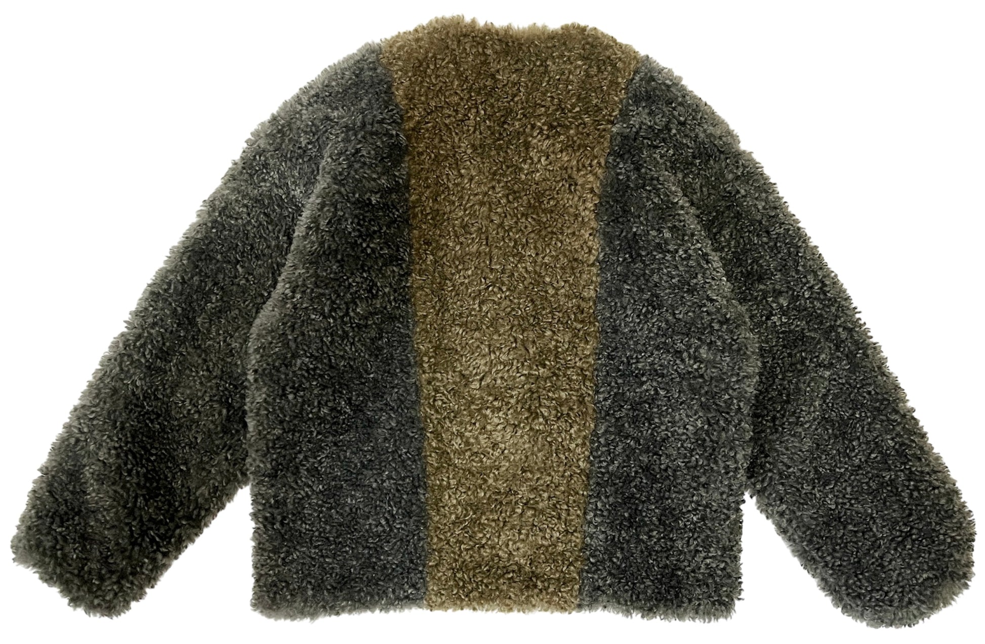 Collarless jacket made of two-colored, long curly sherpa fabrics. Inspired from military lining jacket.