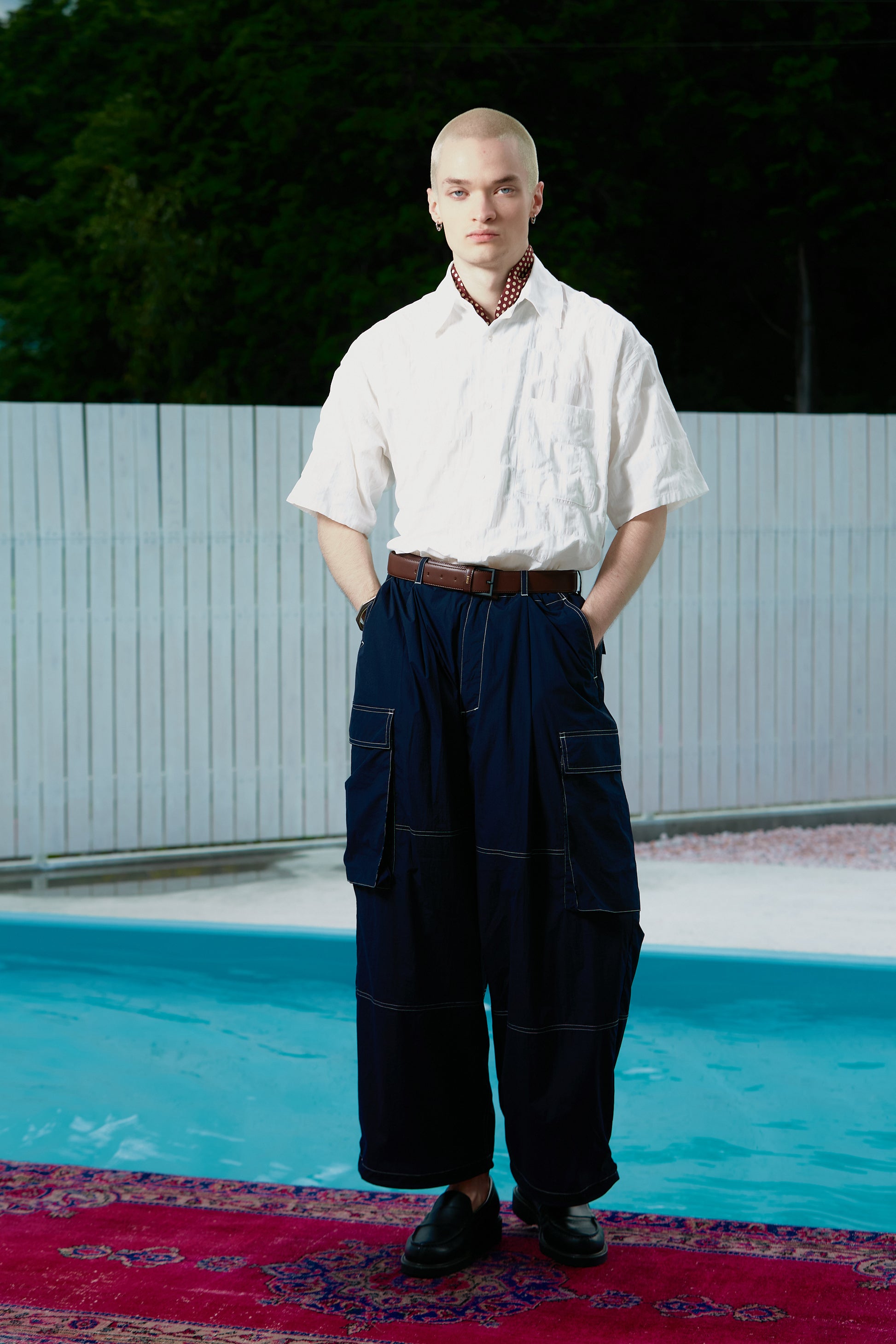 Short sleeve shirt made of seersucker material with a checkered wrinkle pattern. It is a very light, cool material and can be washed.