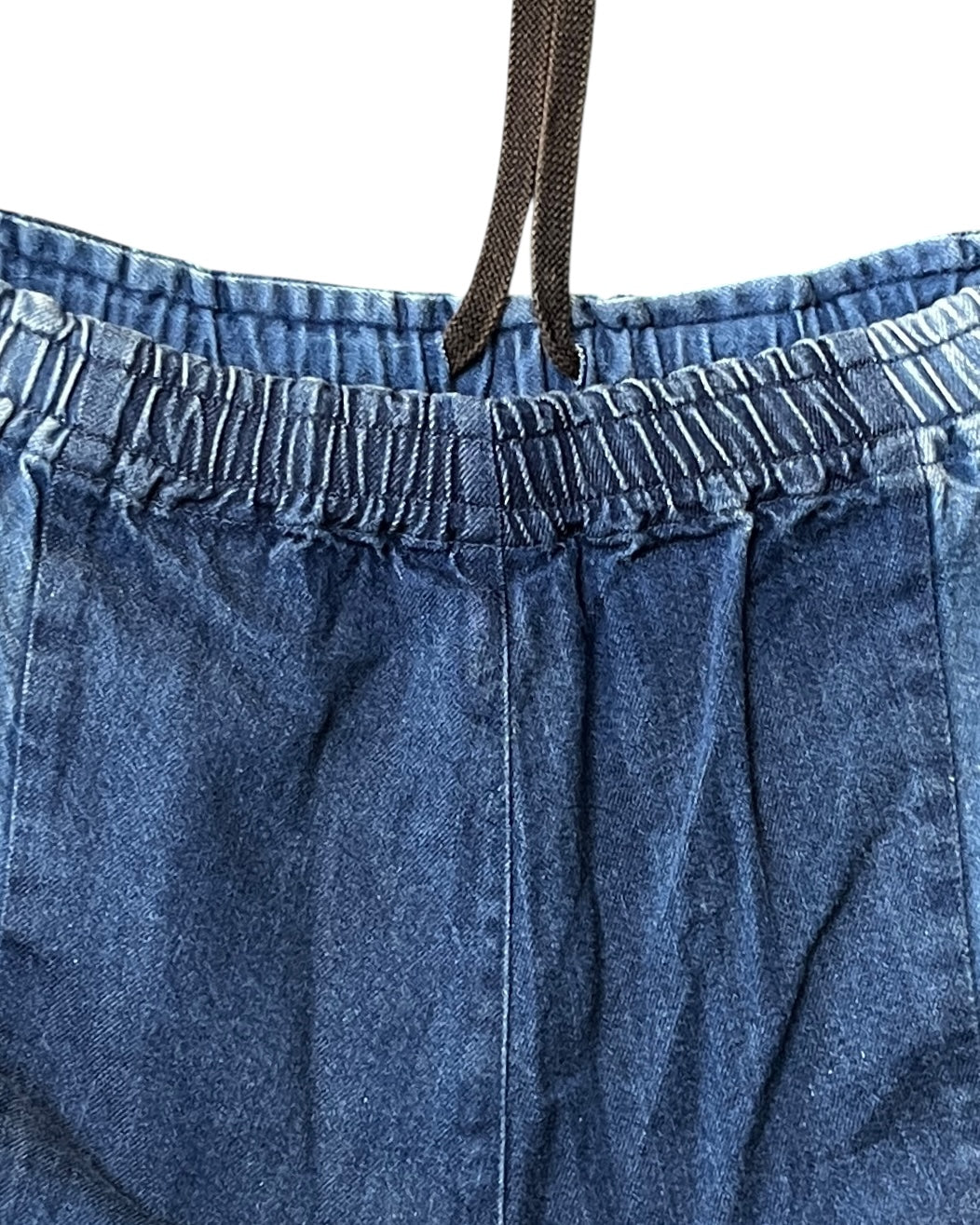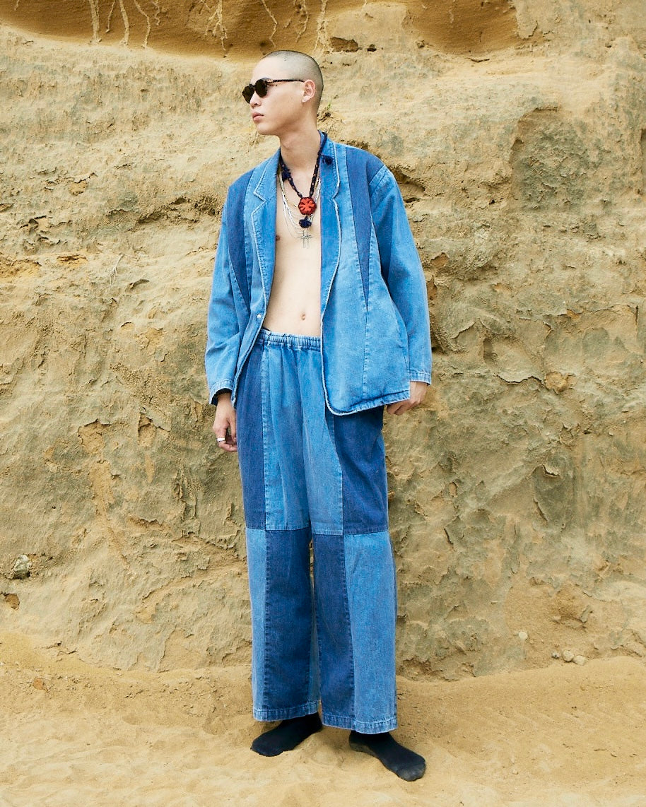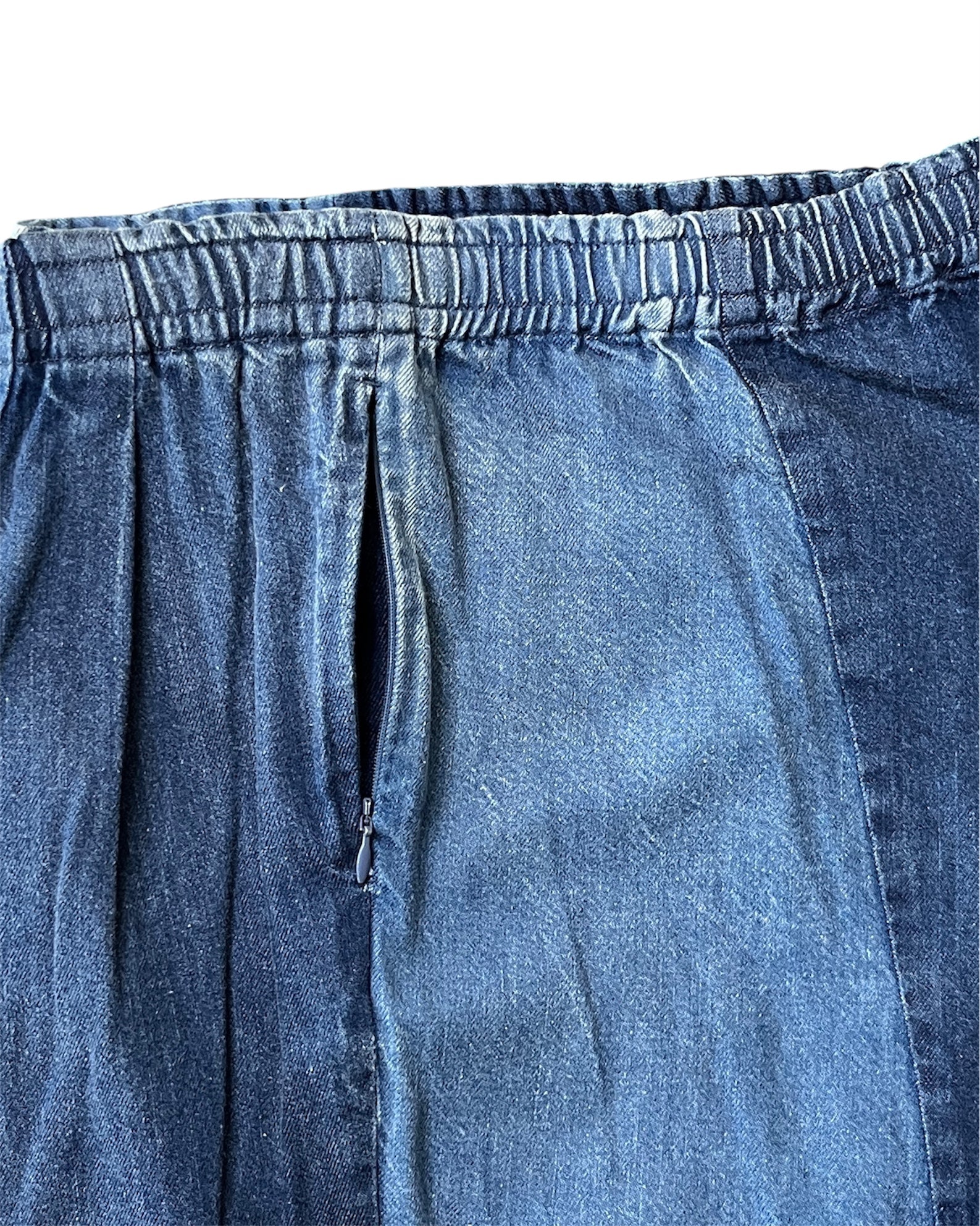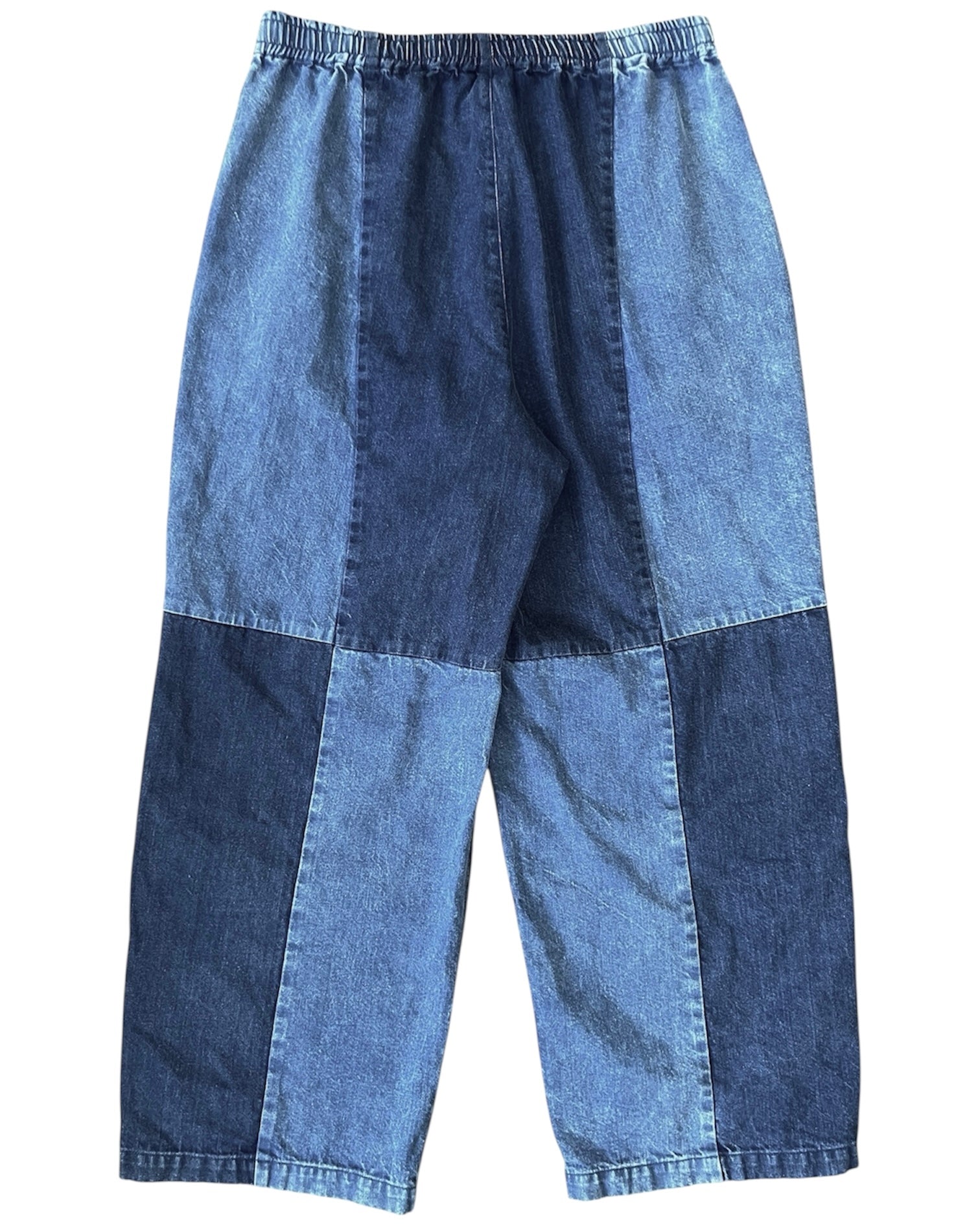 Geometric denim wide pants inspired by the Western style wide pants. The Japanese denim is made from a lightweight 8 oz material perfect for spring and summer, and has been given a vintage wash treatment.