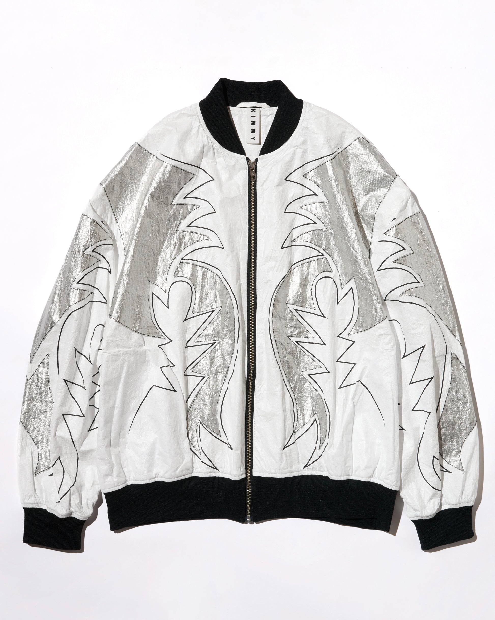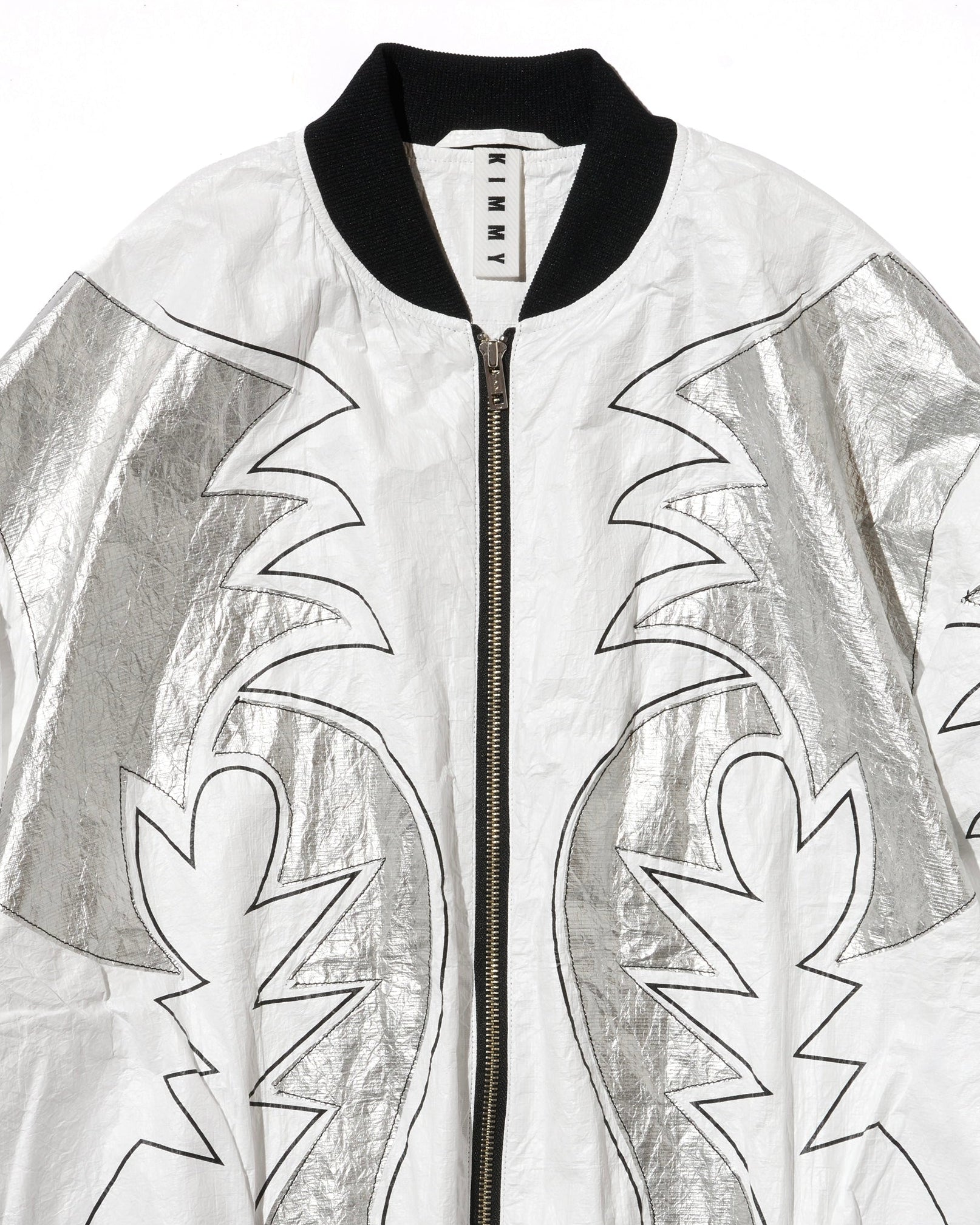 In addition to the print pattern, eight pieces of silver Tyvek are cut into a western pattern and sewn together in parts for a handmade feel.