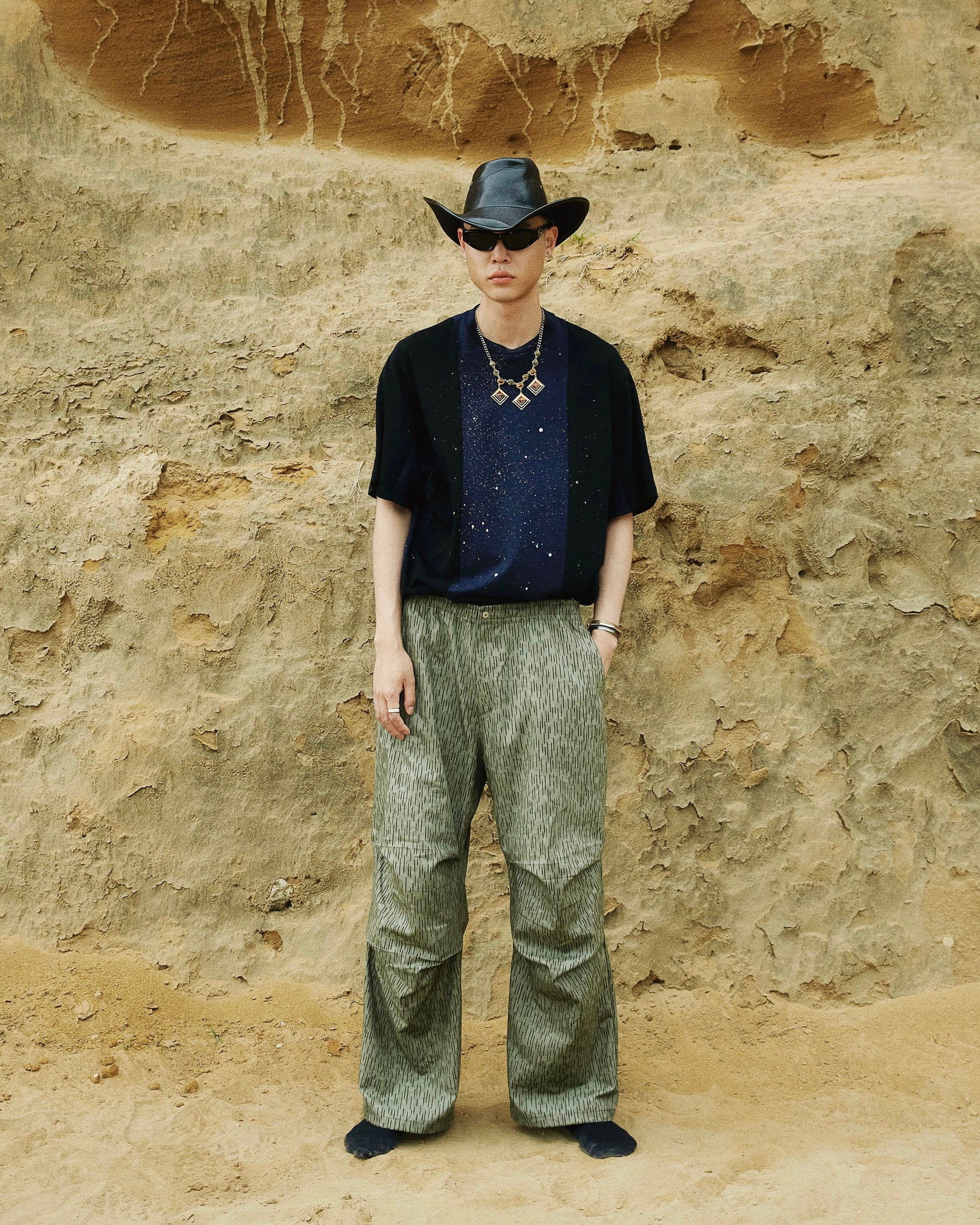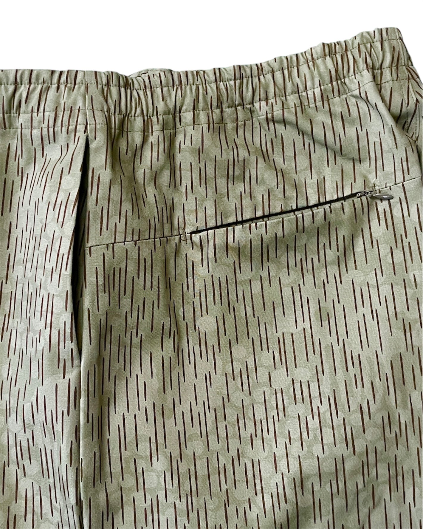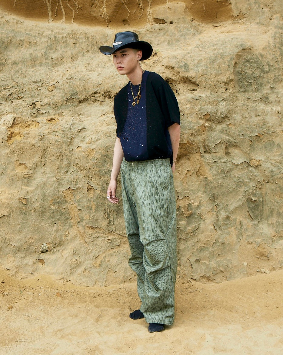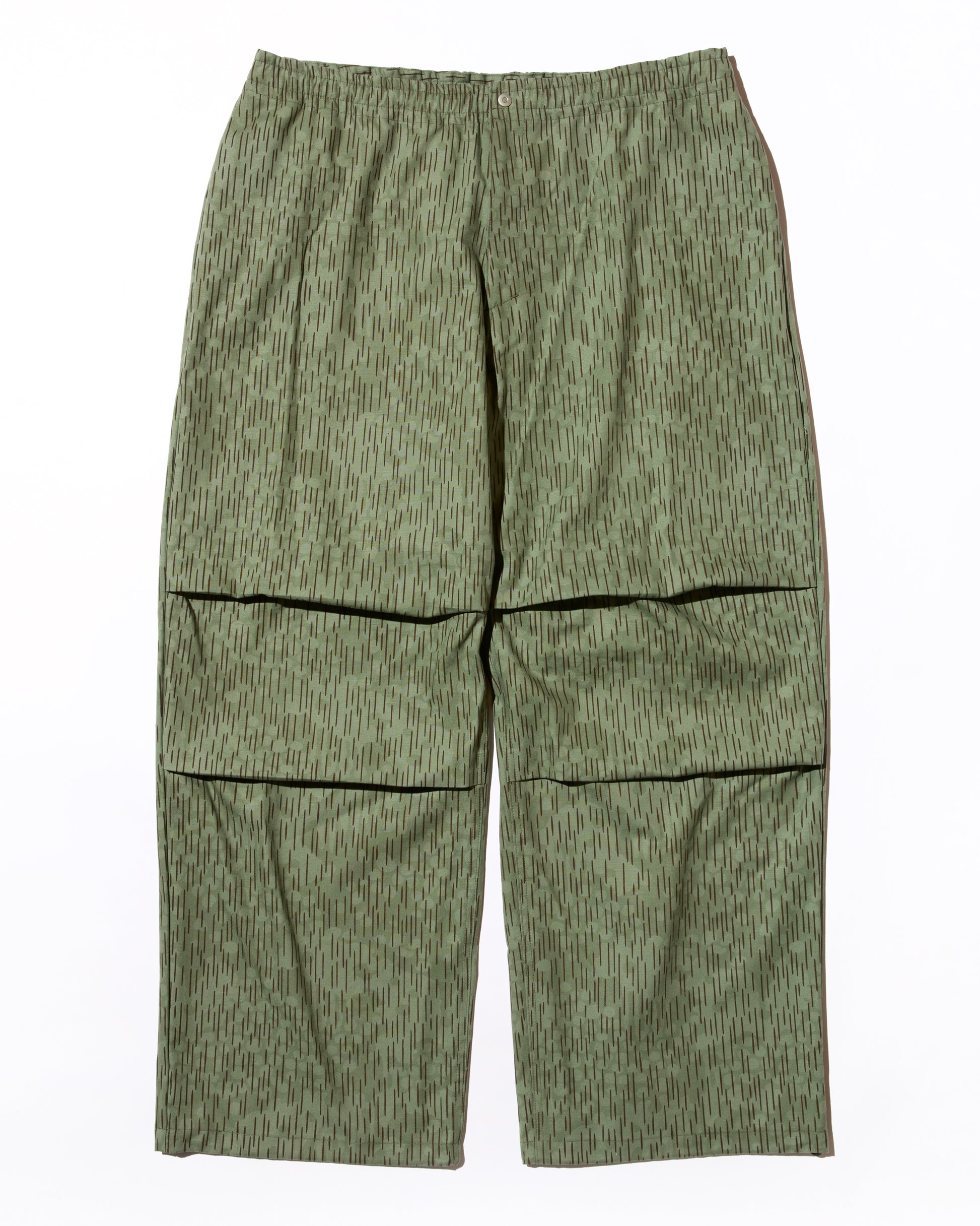 Wide double knee tuck pants with elastic waistband. The oversized waist design is inspired by parachute pants. Vintage raindrop camouflage pattern. The hem can be tightened with a cord.